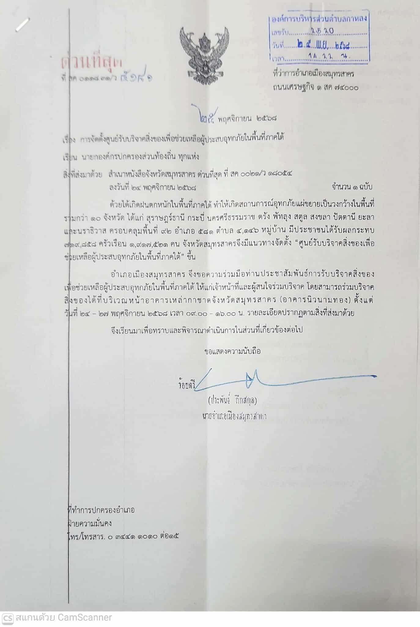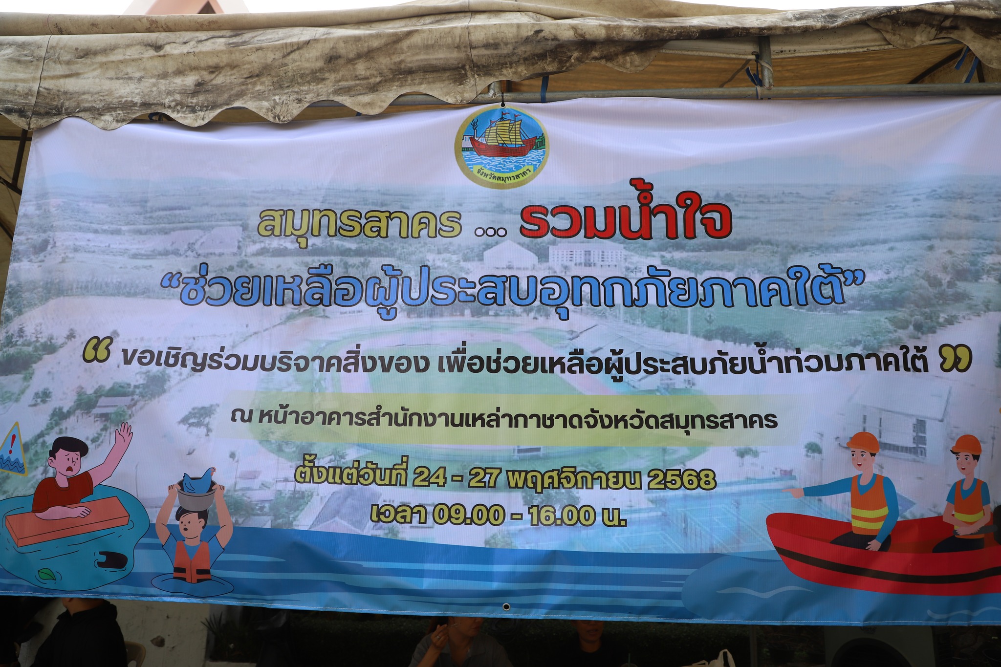 อำเภอเมืองสมุทรสาคร ขอความร่วมประชาสัมพันธ์การรับบริจาคสิ่งของ เพื่อช่วยเหลือผู้ประสบอุทกภัยในพื้นที่ภาคใต้ ให้แก่เจ้าหน้าที่และผู้สนใจร่วมบริจาค โดยสามารถร่วมบริจาคสิ่งของได้ที่บริเวณหน้าอาคารเหล่ากาชาดจังหวัดสมุทรสาคร (อาคารนิวนามทอง) ตั้งแต่วันที่ 24 - 27 พฤศจิกายน 2568 เวลา 09.00 - 16.00 น.